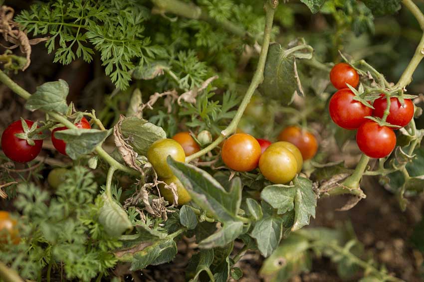 Como acompañantes del tomate, se podrían cultivar junto a sus matas plantas como la albahaca, la cebolla, lechuga, remolacha, que no van a competir con el tomate y que van generar beneficio mutuo, como sombra, humedad y otros factores alelopáticos.